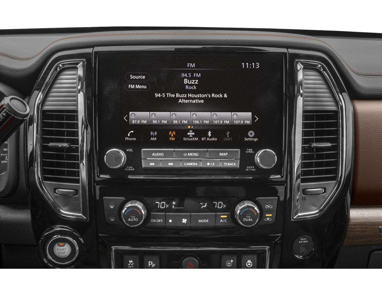 - Radio: NissanConnect w/Navigation -inc: 9" touchscreen display, 12 speaker Fender premium audio system, wireless Apple CarPlay, Android Auto, SiriusXM radio, SiriusXM Traffic, SiriusXM Travel Link w/weather, fuel prices, movie listings, stock info, sports and parking, TomTom weather, Nissan door to door navigation w/3D building graphics and satellite imagery, connected navigation features including online POI search, over-the-air map updates and online premium traffic information, 2 illuminated USB (1 type A, 1 type C) connection ports, Bluetooth® hands-free phone system, streaming audio via Bluetooth®, hands-free text messaging assistant, Nissan voice recognition for navigation and audio and Siri Eyes Free